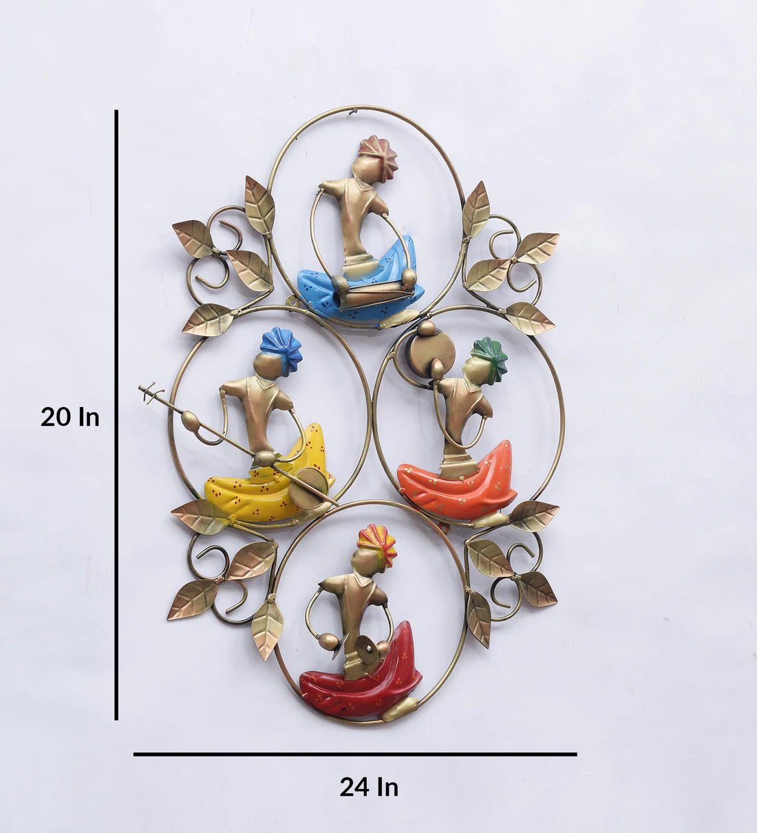 Celebrate the melody of Indian folk culture with the 4 Musician Ring Frame, a beautifully handcrafted wall décor that showcases four traditional musicians, each seated within an elegant metal ring. With bright, colorful outfits and detailed instruments, each figure brings a unique musical element to the ensemble. The golden leafy accents around the rings add a refined artistic touch, making this piece ideal for adding life to plain walls in living rooms, entryways, or creative spaces. Made from high-quality iron and finished with vibrant enamel, this wall art brings harmony, tradition, and joy to your décor. It’s also a thoughtful gift for housewarmings, festivals, or music lovers.