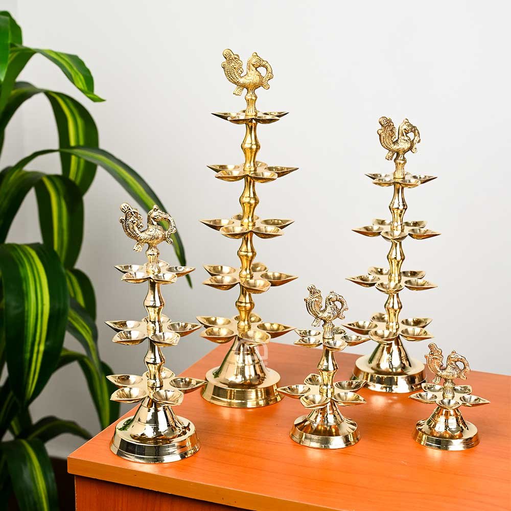 Illuminate your home and temple with the divine radiance of the Mannar Craft Brass 3 Layer Peacock Diya, a beautifully handcrafted traditional Indian oil lamp. Measuring 9.5 inches in height , this diya features a majestic peacock design with three layers, allowing multiple wicks to be lit at once for a grand spiritual ambiance.