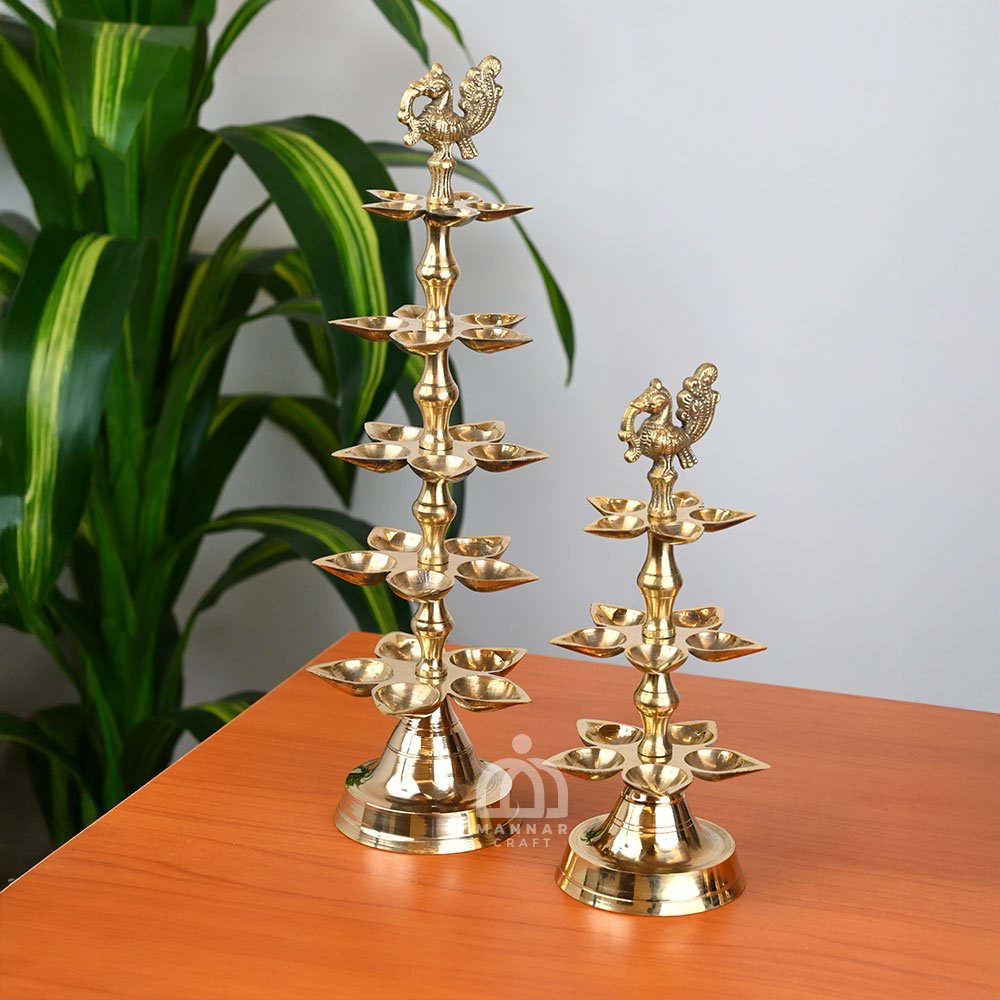 Light up your surroundings with the spiritual elegance of the Mannar Craft Brass 5 Layer Peacock Diya, a handcrafted traditional Indian oil lamp made from pure brass. Measuring 14 inches in height, this diya features an intricately designed peacock at the top with five beautifully arranged layers, each holding multiple wicks for a grand and divine glow.
