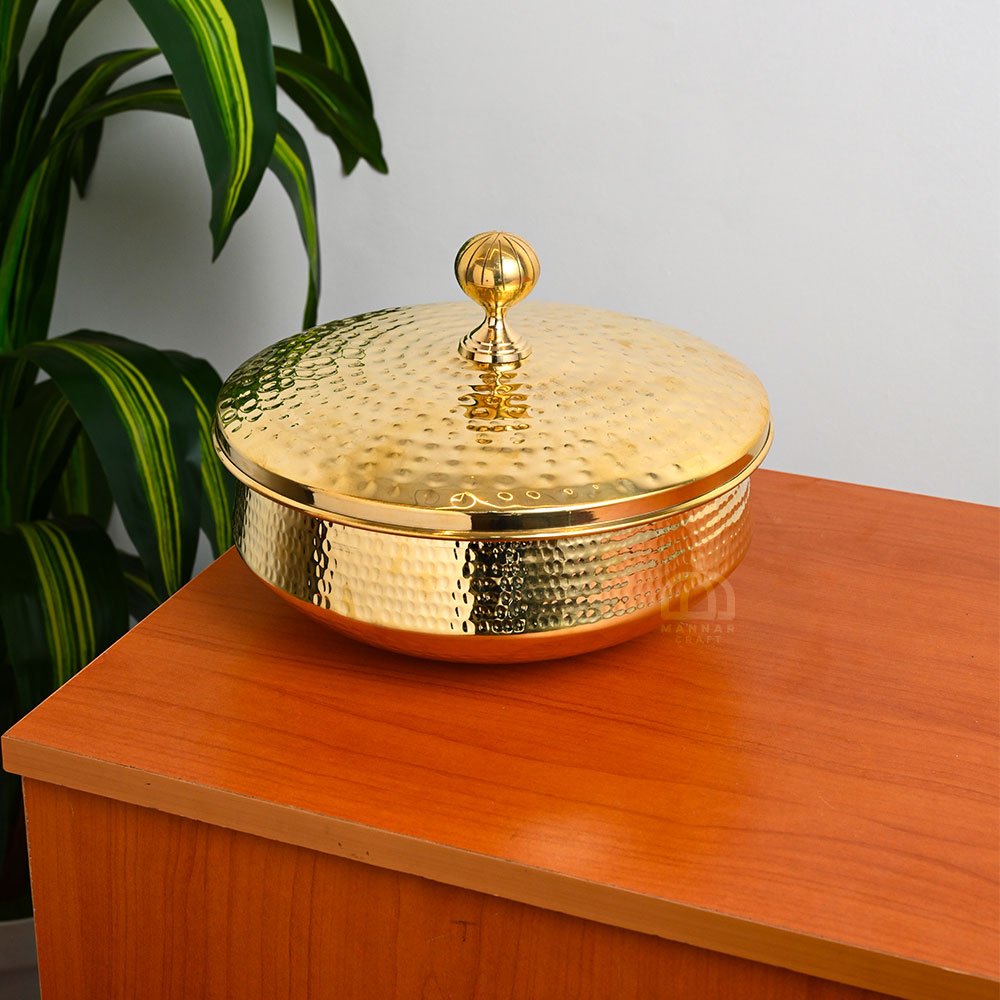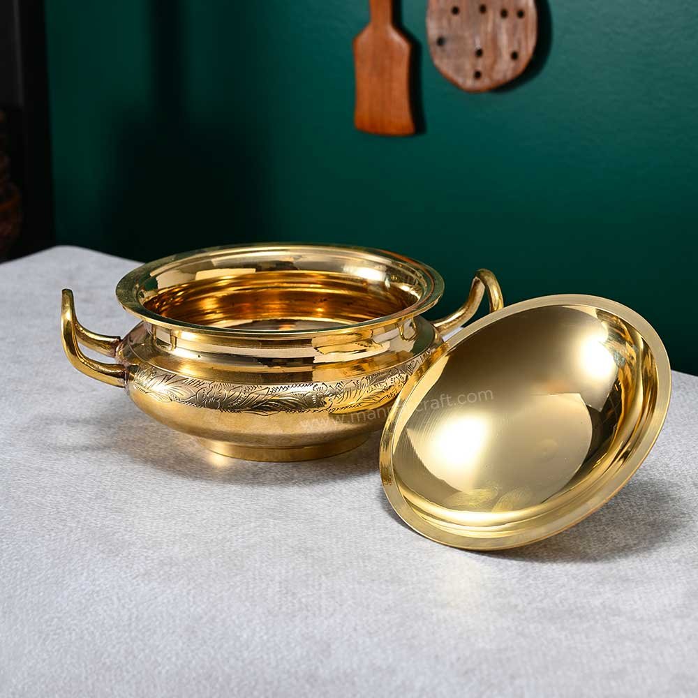 Enhance your dining experience with the Brass Mughlai Embossed Design Casserole with Lid, a perfect blend of traditional artistry and functionality. Handcrafted by skilled artisans, this casserole features intricate Mughlai-style embossing that exudes timeless elegance. The durable brass construction ensures even heat retention, keeping your meals warm and flavorful for longer. Its fitted lid adds to the aesthetic appeal while maintaining the freshness of your dishes. Ideal for festive occasions, family gatherings, or as a unique gift, this casserole is more than just serveware—it's a statement of refined taste and heritage.