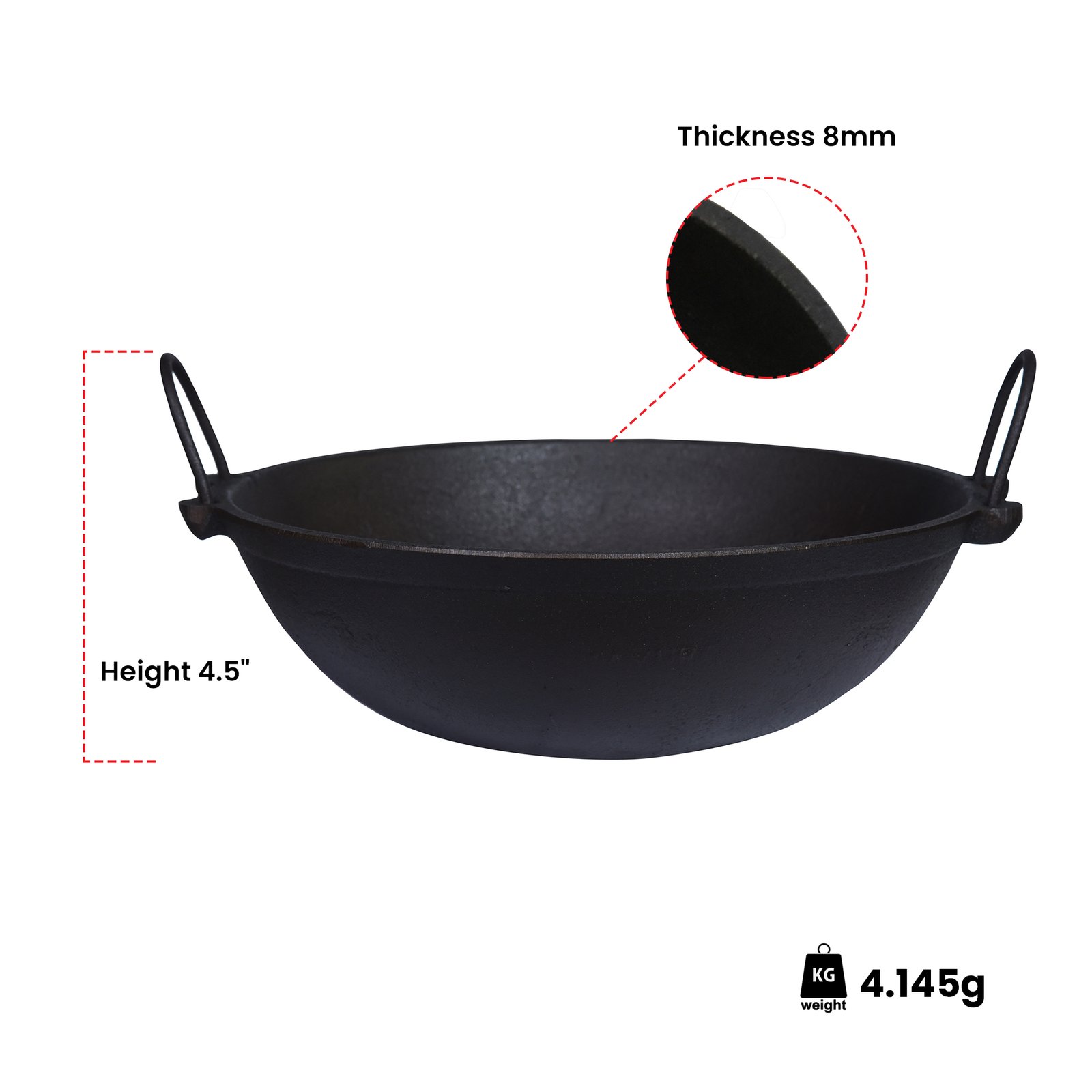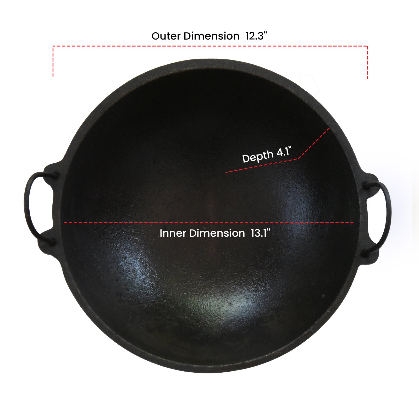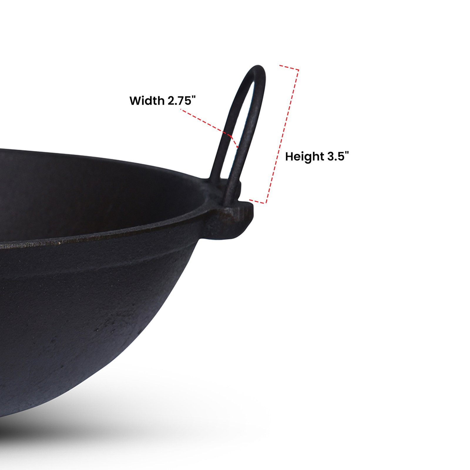 •33.66 x 33.66 x 10.16 cm; 2.5 Kilograms •No cast kadai is rust free. Make sure that after washing it dry it and apply a thin coat of any oil •Handmade with the finest grade iron and built to last for generations.Cooking in a cast iron pan adds a good amount of trace iron in the food, which is beneficial for supplementing dietary iron intake and reducing iron deficiency. This is a handmade product, so please do not expect the finish that you get from a machine made cookwares like nonstick,steel. Our products are made by artisans from God's own country -Kerala. •Cookware is Unseasoned .Before First Use-The traditional way is to seep the raw vessel in water that is used to wash rice (containing starch particles) for a 2 days and then treat with oil so that the oil becomes a coating and makes it rust proof and even non- stick.
