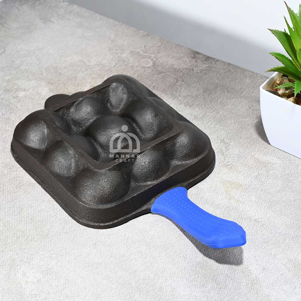 Discover the perfect cooking companion with our Cast Iron Paniyaram Pan! Designed for making delicious and crispy paniyarams (or other batter-based treats), this square-shaped pan features 9 pits, allowing you to cook multiple servings at once. The long handle with silicone grips ensures safety and ease while cooking, offering a comfortable, heat-resistant grip. Made from 100% pure cast iron, this pan is pre-seasoned to enhance its natural nonstick properties, making it toxin-free and safe for daily use. Enjoy even heat distribution for perfectly cooked, crispy paniyarams every time. Ideal for a variety of batter-based recipes like appe, and more. Whether you're a seasoned chef or a beginner, this cast iron pan will elevate your cooking experience. Upgrade your kitchen today with this durable, eco-friendly, and versatile paniyaram pan!