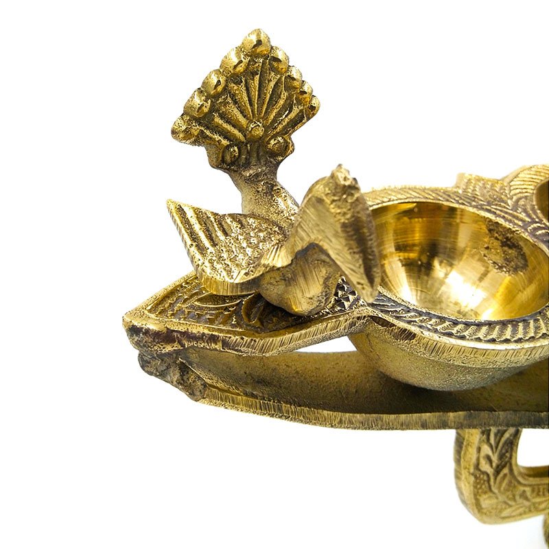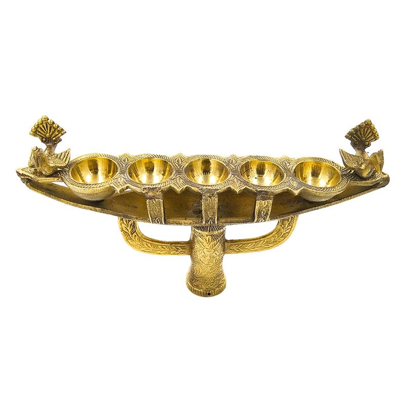The vanchi vilakku or ‘boat lamp’ derives its name from its boat-like drip basin. As is customary, this vilakku has five holders in which oil-soaked cloth or cotton wicks were set aflame. The drip basin is supported on a trident-shaped metal frame mounted on a tapered wooden stem that terminates on a rounded base. Such flame-lamps are reserved for use during temple processions. During the annual festival of the Kottan Kullangara Devi Temple near Chavara in Kollam, for example, thousands of men dressed in traditionally female attire walk in procession. to the temple carrying lit vanchi vilakku. Cross-dressing is a ritual offering intended to please the presiding goddess and win her intercession in matters related to the devotee’s career, health, and marriage as well as to secure the well being of the family. The vanchi vilakku is also an important element in the annual festival at the Thiruvarppu temple at Kottayam. During the festival, girls under the age of ten dress themselves as Lord Krishna, the resident deity, and ritually offer lamps to the deity during the morning and evening