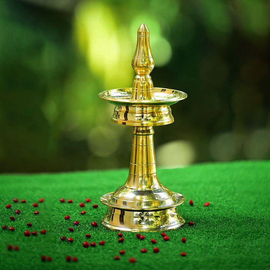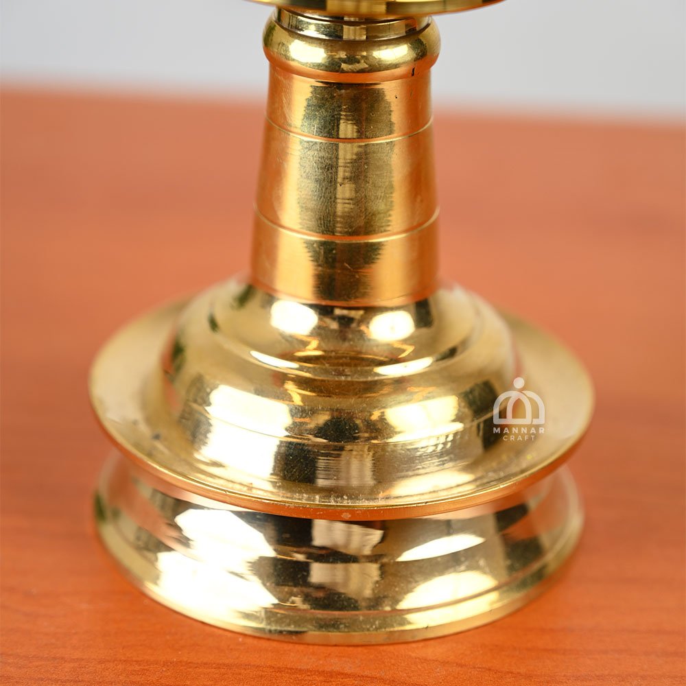 Bring the serenity of temple prayers into your home with this exquisite Ganapathi Vilakku, a handcrafted brass oil lamp. This traditional Nilavilakku features intricate designs. Fill your temple, pooja room, or living space with the warm glow of calming lights, perfect for meditation and relaxation. Crafted from high-quality brass by skilled artisans in Kerala, this lamp is a stunning addition to your décor and makes a meaningful gift for weddings, housewarmings, or any special occasion.