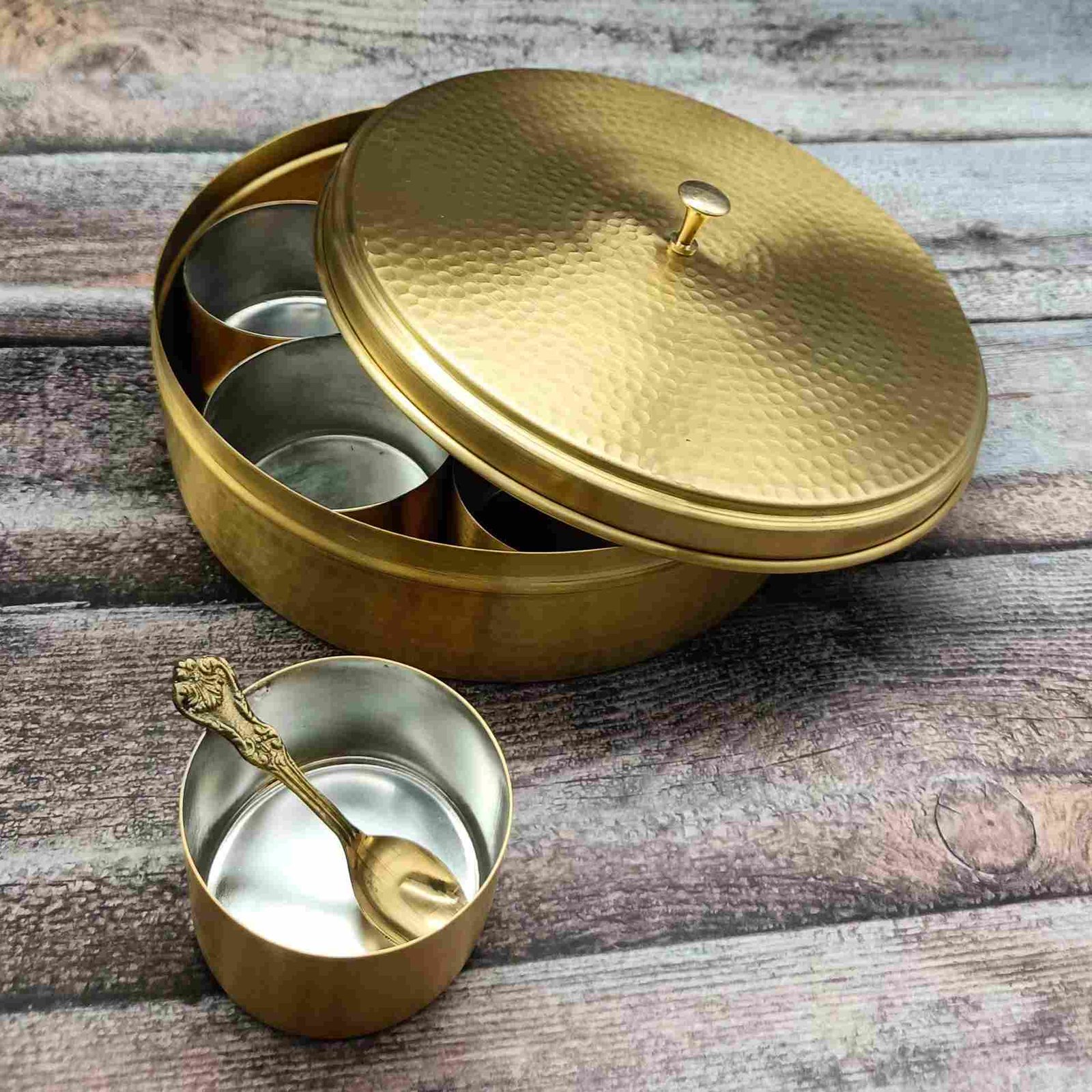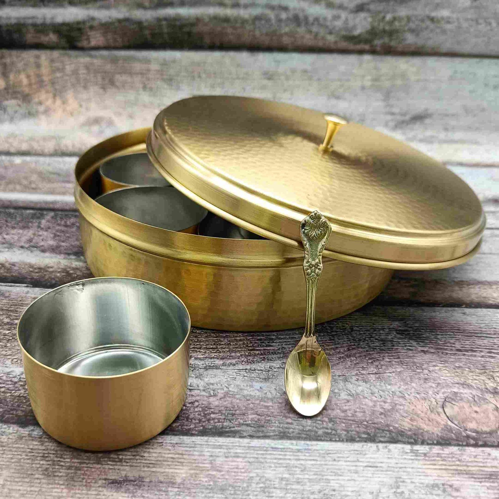 Handcrafted Brass Hammered Masala Daani | Masala Box with Lid & 7 Tin-Coated Containers | Traditional Spice Storage Box for Kitchen with Spoon - 8 Inch