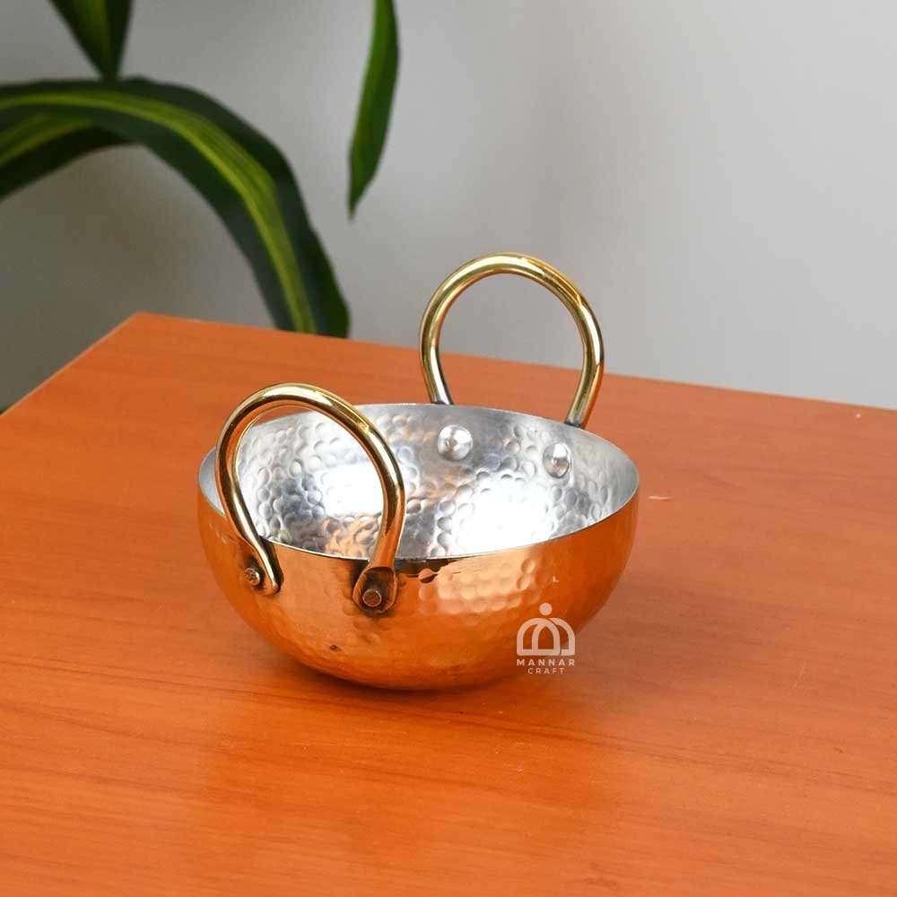 Add a touch of tradition to your kitchen with the Handcrafted Brass Kadai by Mannar Craft. Designed with a hammered finish and sturdy dual handles, this 5.5-inch kadai (290 gm) is perfect for both cooking and serving.