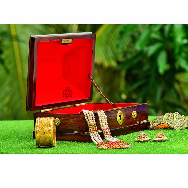 Experience the charm of Kerala's rich heritage with this Handmade Kerala Traditional Rectangular Jewel Box with Lock. Crafted with precision, this elegant jewelry box is perfect for storing your precious ornaments securely. Designed with intricate detailing, it reflects the timeless artistry of Kerala craftsmanship. The sturdy build and secure lock mechanism ensure the safety of your valuables while adding a touch of tradition to your decor. A perfect gift for loved ones or a timeless addition to your collection!