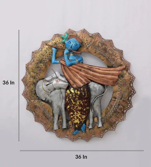 Handcrafted metal wall art of Lord Krishna with cow motif