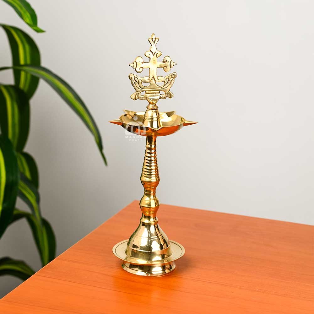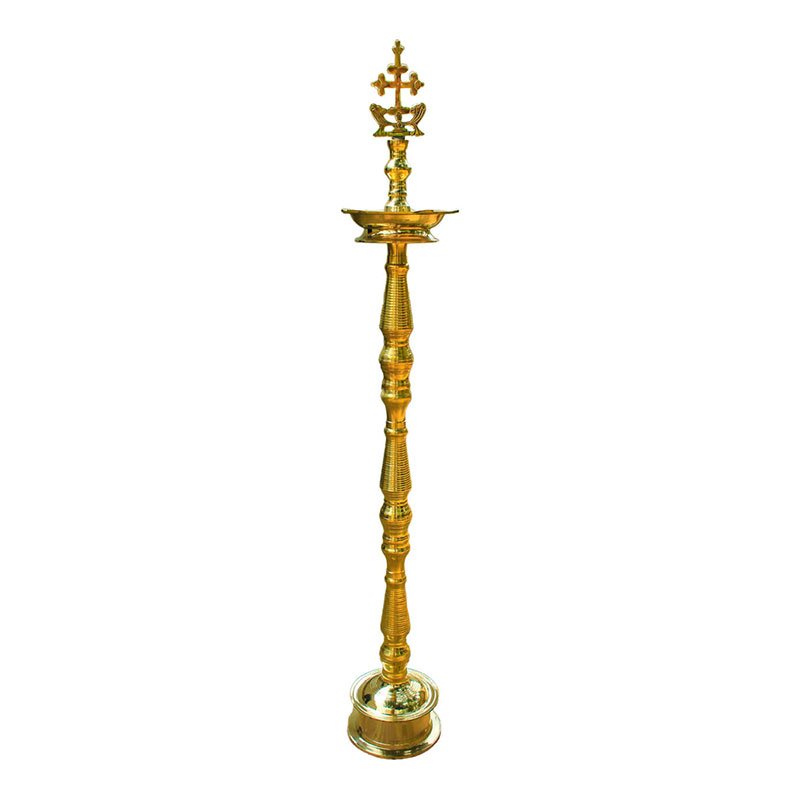 The oil lamp resembles the Nilavilakku or floor lamp traditionally used in Hindu temples and homes. It has a circular base, a tall stem with ringed turnings culminating in a broad oil well. However, the elongated finial that surmounts the Nilavilakku is replaced in this example by the Cross associated with the Jacobite Syrian Christian community. Oil lamps or Vilakkus, a ubiquitous element in Hindu temples, domestic shrines, and homes were incorporated into the rituals of early Christian converts in Kerala, a telling example of enculturation. The lamps used in Christian households, especially in St Thomas traditions, are often identical in form and crafted using the same processes as their traditional Hindu counterparts and are also lit during the daily prayers held each morning and evening. Brass lamps may also be placed in the front of the house during church festivals and on days when religious processions are held.