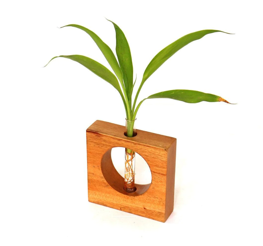 The package contains a wooden holder with a test tube to hold your plant. The wooden frame which holds the vase is stable and sturdy. The glass tube vase is also high quality which provides a good growing environment for your plant FEATURES material - Mahogany Shape