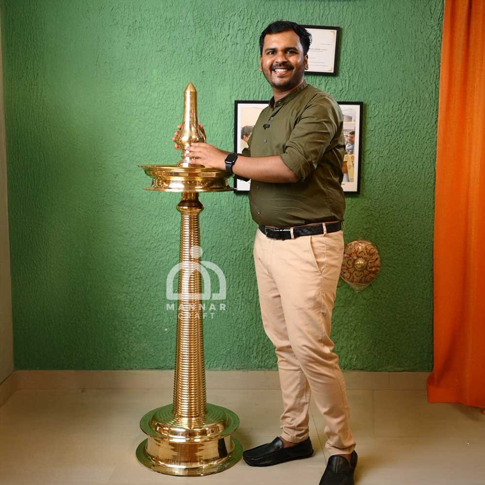 Elevate your home decor, gifting, and inauguration ceremonies with this majestic Kerala traditional big Nilavilakku brass lamp. Standing tall at 5 feet height and weighing 40 kg, this stunning lamp boasts a 16-inch thattu diameter. Its intricate designs and traditional craftsmanship make it a perfect addition to any setting.