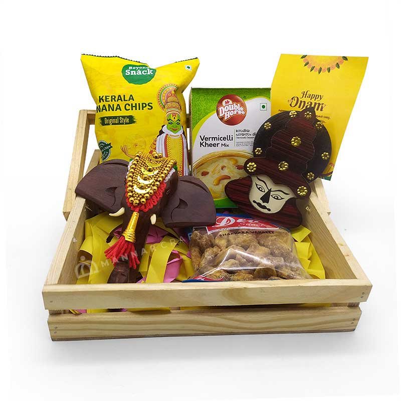 This thoughtfully curated gift set includes a 6-inch Elephant Head with Nettipattom, a 4-inch Kathakali Head, 100g of crispy banana chips, 300g of Double Horse Payasam Mix, and 150g of Dev Snacks Sharkara Varatty – all iconic elements of an authentic Onam celebration.