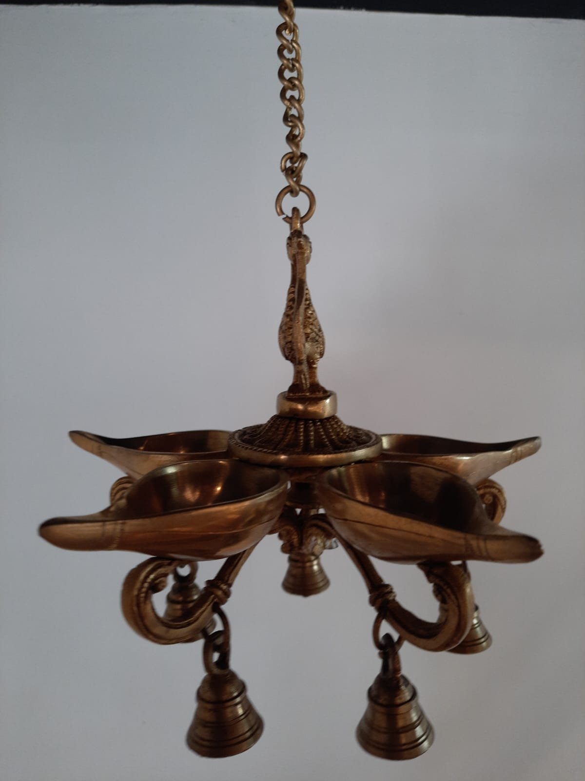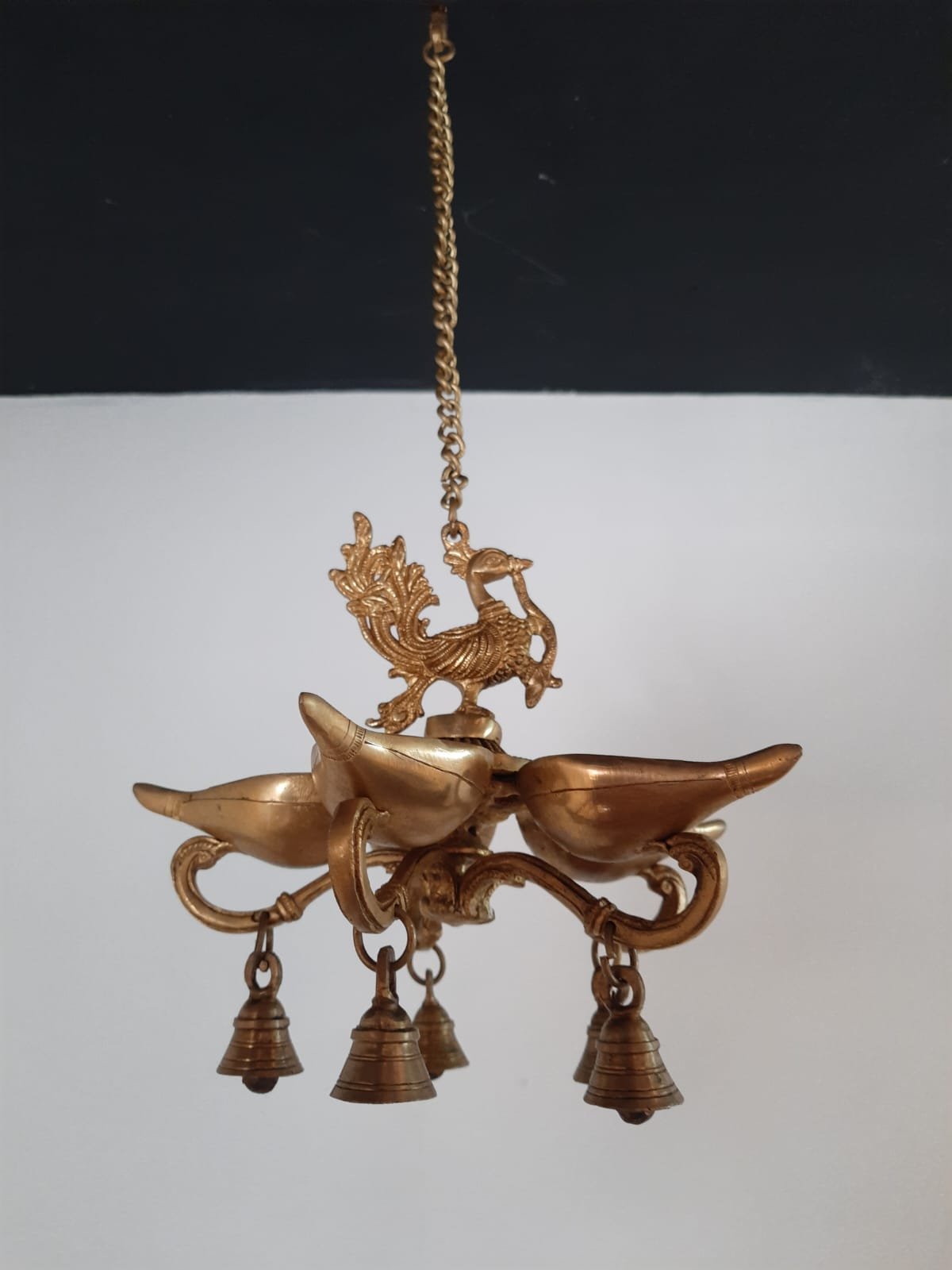 This lamp features an elegant design with intricate details that are sure to catch the eye. It is finished in a sleek and sophisticated color that will complement any decor scheme. The Hanging lamp comes with a chain that makes it easy to hang anywhere you desire. Whether you choose to hang it on your pooja room, or in your living room, it will add a charming touch to your space and create a relaxing atmosphere.