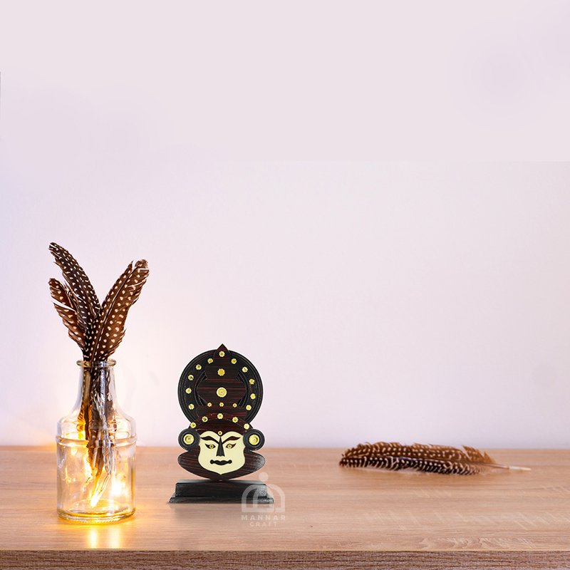 A perfectly finished and polished Handcrafted kathakali face with a wooden stand is ideal for home and office. A good showpiece for a gift.