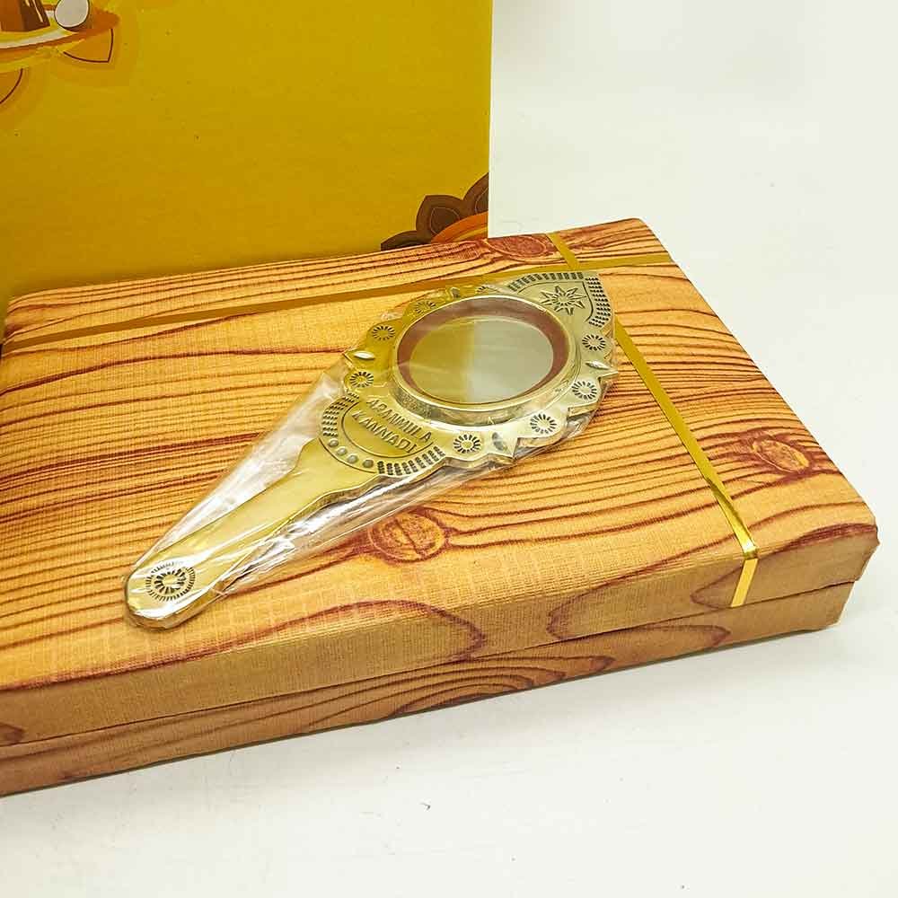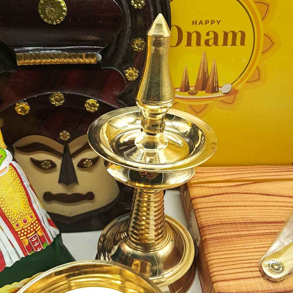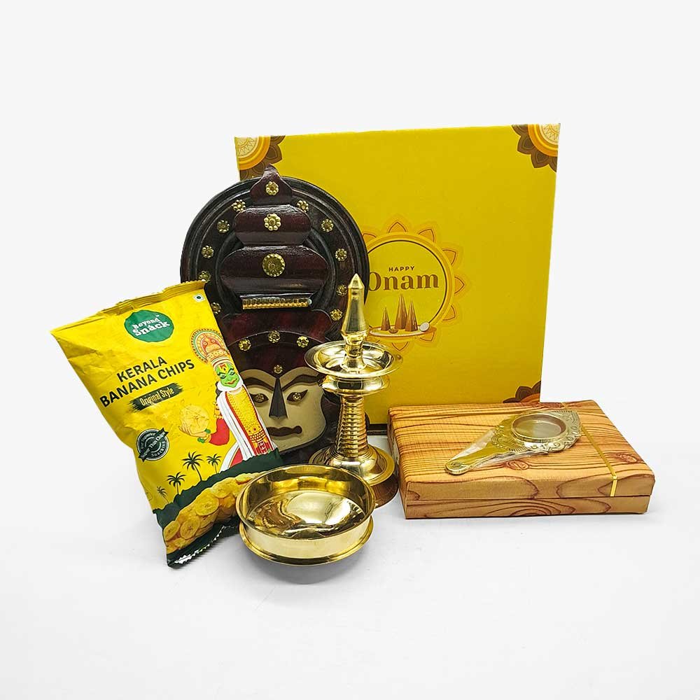 Celebrate Onam with a thoughtful gift! Our exclusive Onam gift combo features 5 traditional Kerala handicrafts: Aranmula Kannadi, Nilavilakku, Kathakali Face, Small Decorative Uruli, and Delicious Banana Chips. Perfect for gifting to loved ones or decorating your home during Onam celebrations.