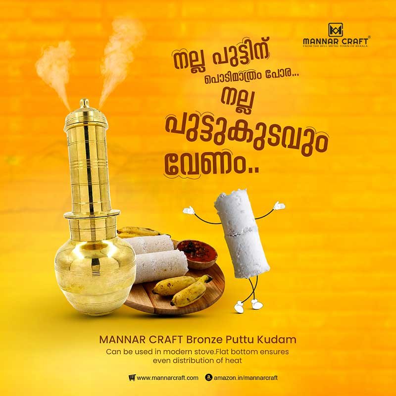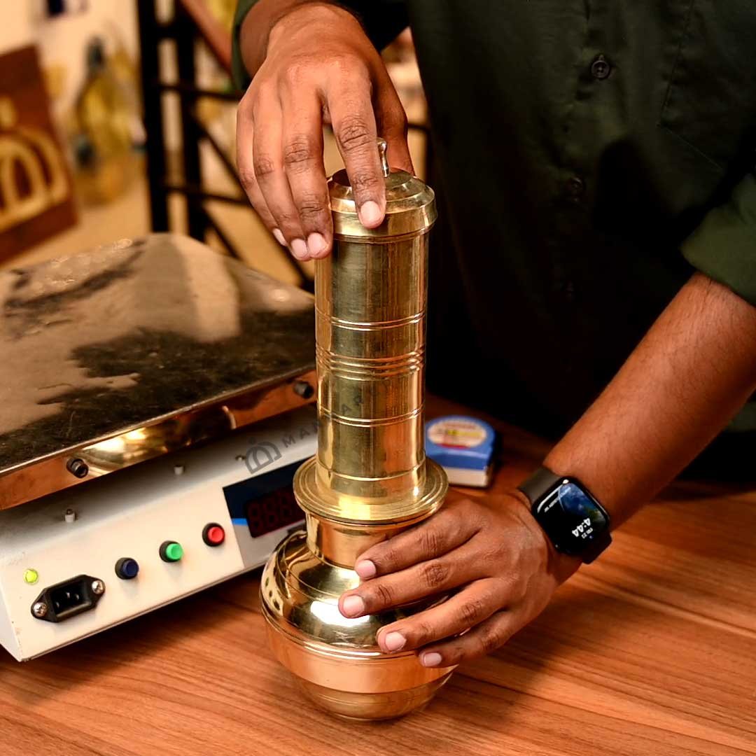 Looking for a way to make authentic South Indian puttu at home? Our polished bronze puttu maker is the perfect solution. Made of high-quality bronze, this puttu maker heats evenly and efficiently, ensuring that your puttu is cooked perfectly every time. The bronze also helps to steam food without losing nutrients, making your puttu healthy and delicious. Our puttu maker is easy to use and clean. Simply add your puttu batter to the inner cylinder, place the lid on top,and put it on the stove.. In just a few minutes, you'll have a delicious and nutritious bowl of puttu. Clean it like any other cookware, using soap and a soft scrubber. It's best to avoid metal scrubbers altogether, as they can scratch and damage the surface. |