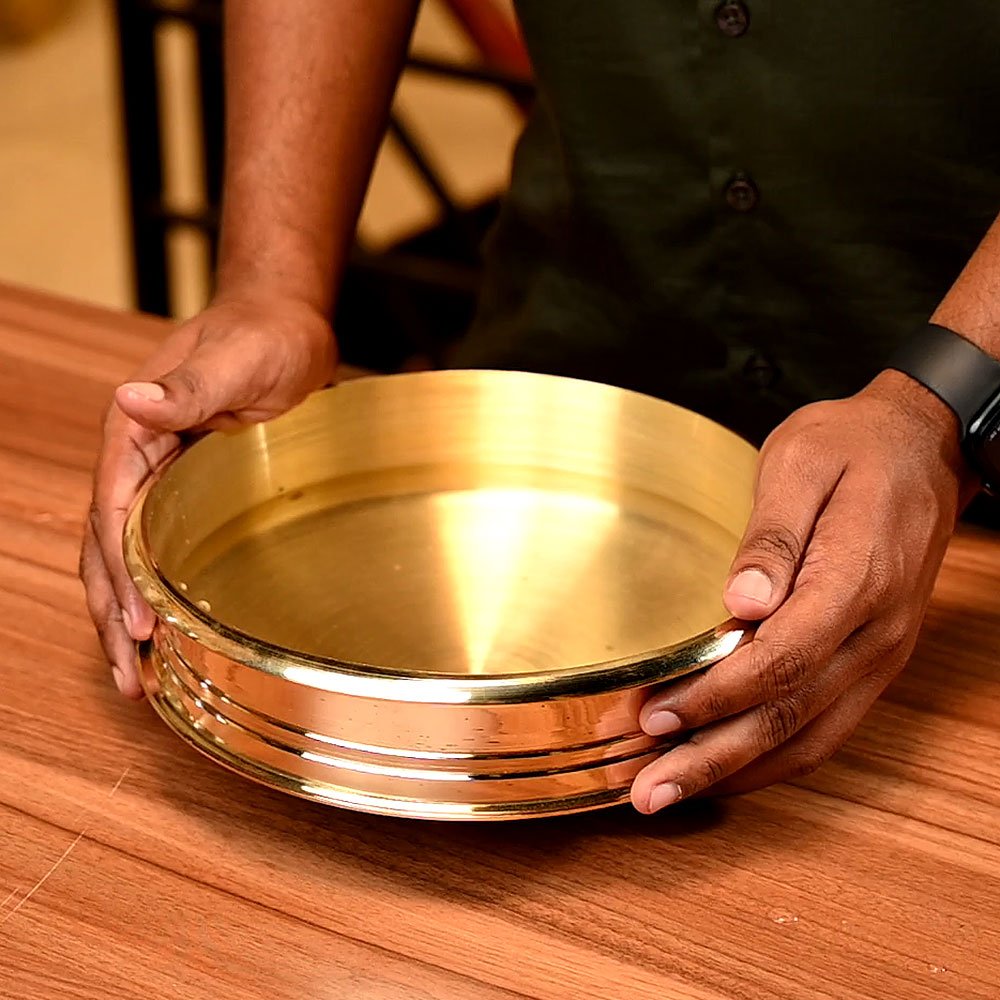 Mannar Craft polished bronze uruli featuring a convenient flat base. This handcrafted wonder is perfect for achieving authentic South Indian flavors in your favorite dishes. Experience even heat distribution and effortless cleaning thanks to the polished bronze and flat base design. Ideal for payasam, and a variety of curries, this traditional uruli adds a touch of elegance to your kitchen while preserving cultural heritage. Upgrade your cookware collection and discover the beauty of authentic cooking with our polished bronze flat base uruli.