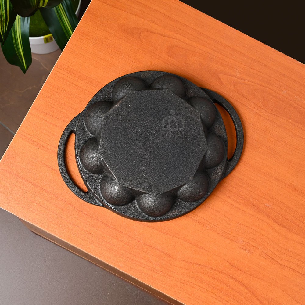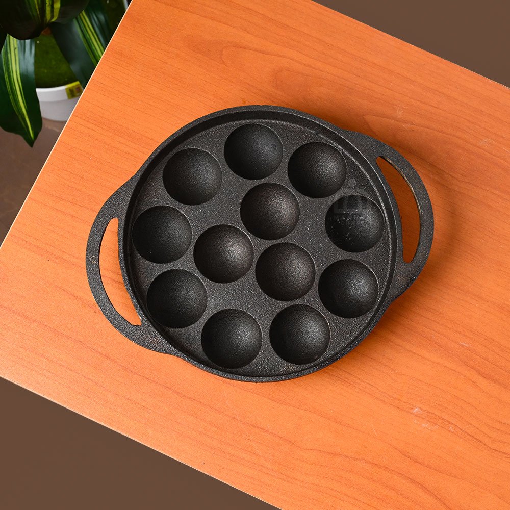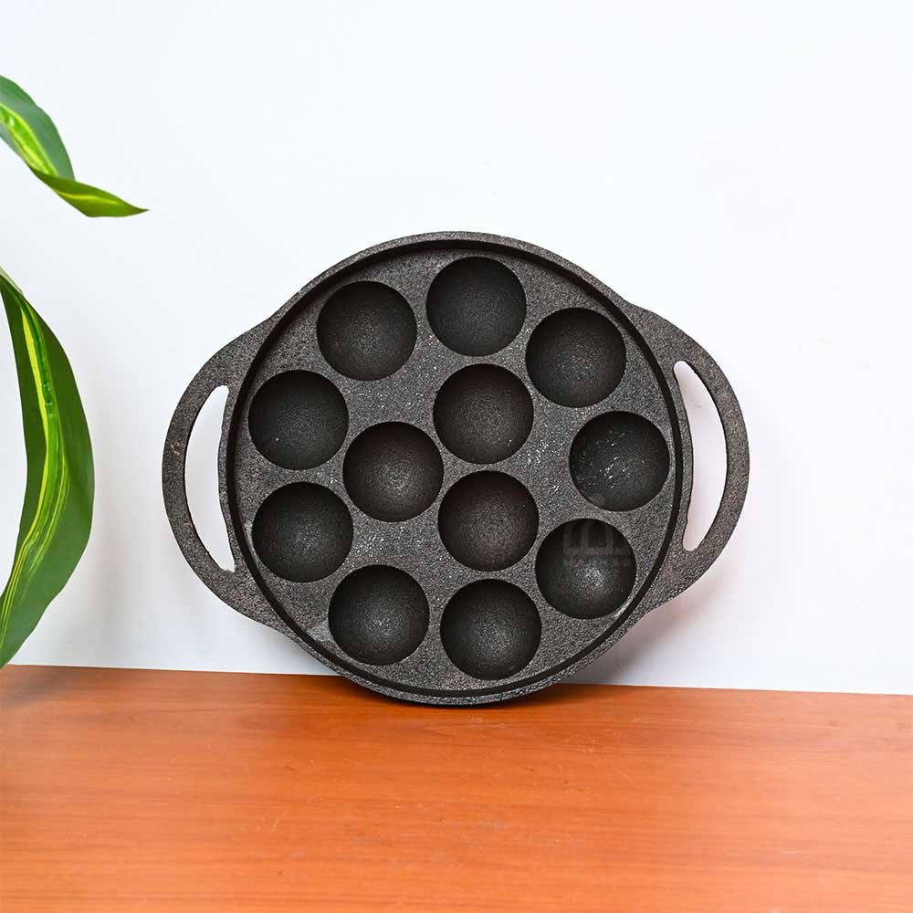 Enjoy traditional South Indian delicacies the healthy way with this Pre-Seasoned Cast Iron Paniyaram Pan featuring 12 uniform moulds and a flat base for stable cooking. Perfect for making soft and crispy kuzhi paniyarams, appams, sabudana vadas, and more. The smooth finish ensures even heat distribution and easy food release without synthetic coatings.