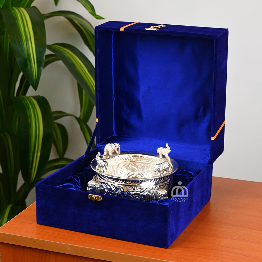 Enhance your home décor with this Set of 5 Elephant Brass Urli Bowls by Mannar Craft. Each 6-inch urli is crafted from premium brass and features a beautiful elephant design, symbolizing strength, wisdom, and prosperity.