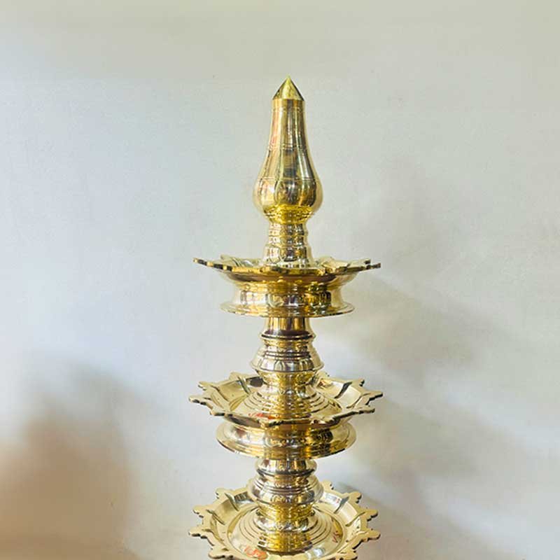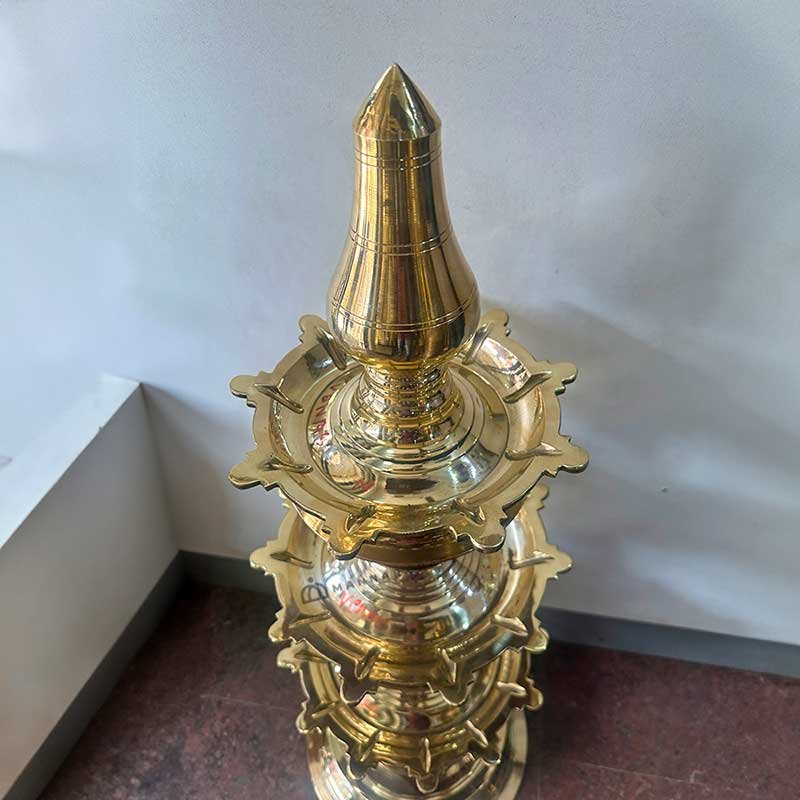 Elevate your temple decor with the exquisite Stambha Vilakku, a traditional brass oil lamp designed to bring a touch of divine elegance to your sacred space. Standing tall at 3 feet, this majestic lamp features three layers that symbolize spiritual ascent and enlightenment. Ideal for temple use, its intricate craftsmanship and timeless beauty make it a perfect addition to any devotional setting. Illuminate your worship area with the warm, golden glow of this beautiful Stambha Vilakku, and create an ambiance of peace and tranquility.