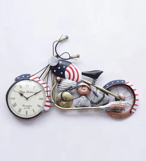 Turn heads with this US Watch Bike Wall Décor, a perfect blend of patriotic flair and vintage charm. Designed in the shape of a classic motorcycle, the wall piece features an American flag-inspired paint theme and a fully functional clock in the front wheel. The finely detailed frame includes metallic textures, realistic engine elements, and retro curves, making it a standout piece for any wall. Whether you're sprucing up a man cave, café, or living room, this décor item delivers both function and flair. Made from sturdy metal, it's lightweight, easy to hang, and battery-operated—offering timeless style in more ways than one.