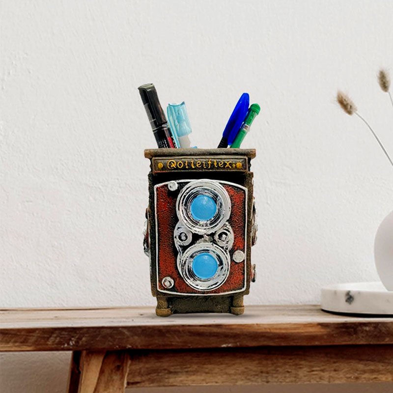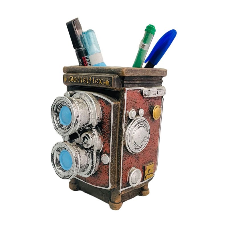This vintage camera pen holder is the perfect addition to any office table. Made with high-quality materials, this holder is designed to resemble an old-fashioned camera. The camera body is made of wood and has a vintage finish that gives it a timeless look. The lens is made of glass and can be used to hold pens, pencils, and other writing instruments. The holder is also equipped with a built-in stand, which makes it easy to place on any flat surface. This unique and stylish pen holder is a great way to add a touch of nostalgia to your office space. It's not only a functional item but also a unique decorative piece that makes a great conversation starter. Whether you're a professional photographer or just a lover of vintage items, this camera pen holder is sure to be a great addition to your office.